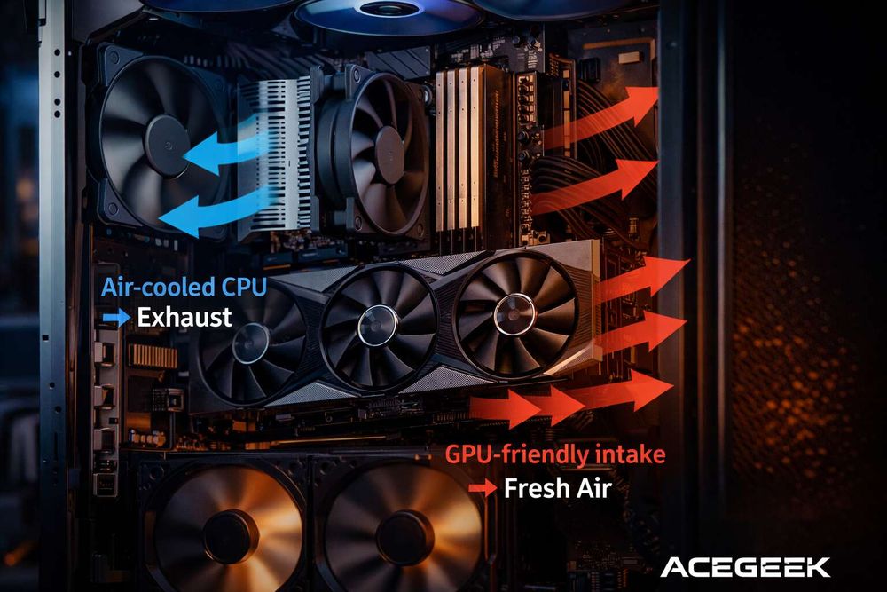 And yes, the chassis matters more than people want to admit. ACEGEEK’s own article on how to choose the right PC case for your build gets one thing exactly right: cooling and fan support, plus GPU and CPU cooler clearance, are not filler specs; they decide whether your airflow plan is even physically possible. Their DIY PC build guide says the same in simpler language, pointing readers toward mesh intake, directed GPU airflow, and cable management that does not choke the case.